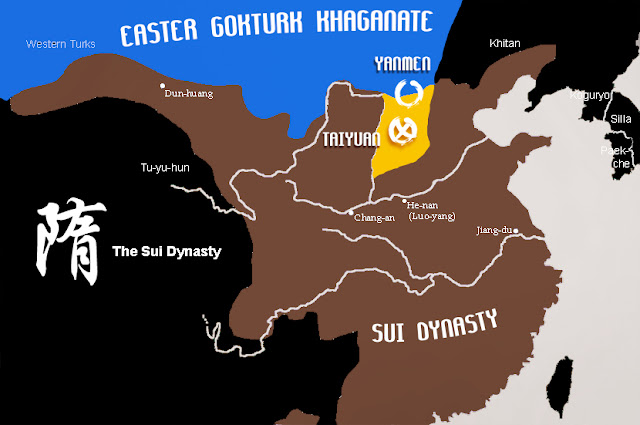 The Gokturk empire was one of the greatest superpowers of 6th century East Asia. A century before the Tang, Turkic people had established a sprawling state along the entirety of the Eurasian steppes stretching from Manchura to the Crimean shores of modern Ukraine, flanking the entire back of the Sassanian Empire, to end only at the boarders of the Byzantine Empire. During their expansion the Gokturks also vigorously invaded and plundered northern China first against the Northern Zhou, then the Northern Qi. But by the dawn of the Sui dynasty, their strength was greatly weakened. A massive civil war which spanned 20 years broke out due to succession disputes and split the Gokturk realm into two halves. However by the reign of inept Emperor Yang of Sui, their strength was mostly restored.