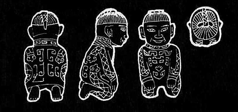 A barefeet Shang dynasty supplicant wearing a surcoat with a Taotie 饕餮 or monster mask commonly found on ancient Chinese