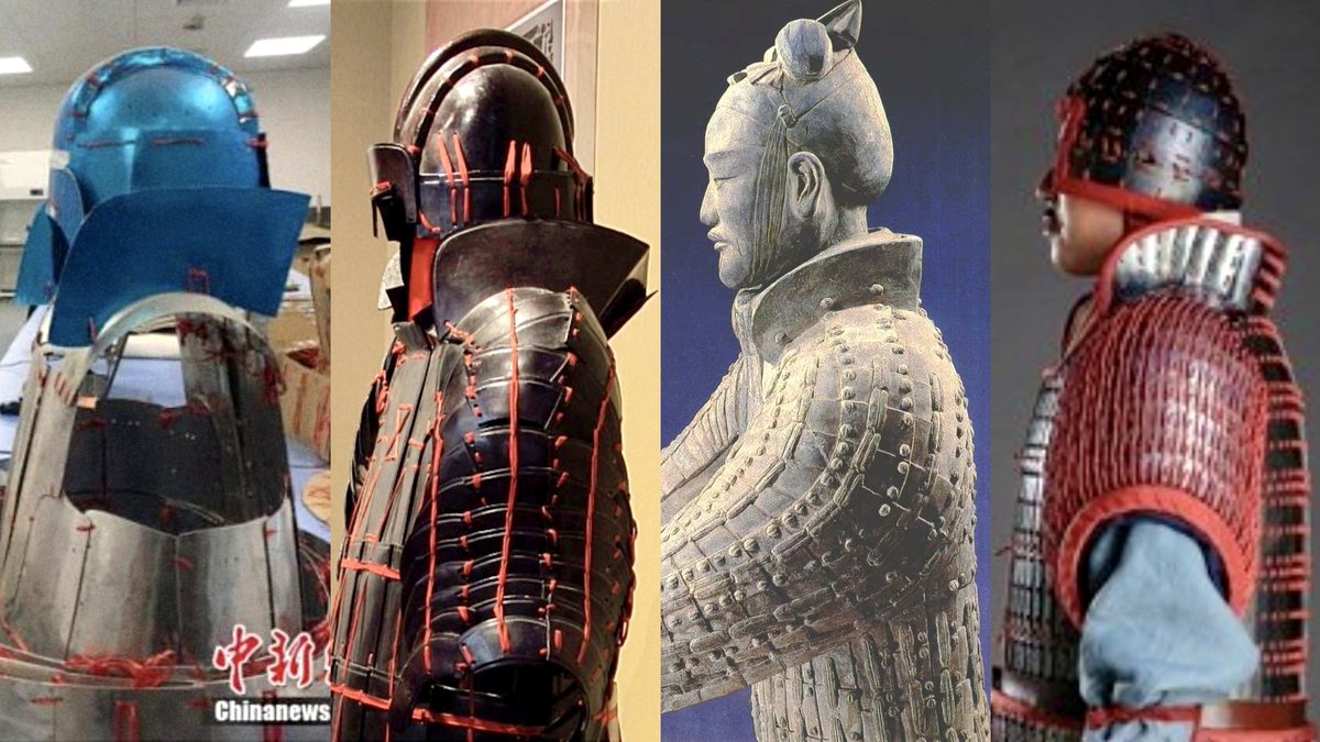 Perhaps the most notable unique quality of these armors is their flared raised neck guards (right)- which provides protection against glancing blows and cuts from polearms such as the Ji (halberd) and ge (dagger axes). Neck guards would continue well into the future centuries even on examples from the Qin armor from the Terracotta Warriors (left) and even the ensuing Han dynasty.